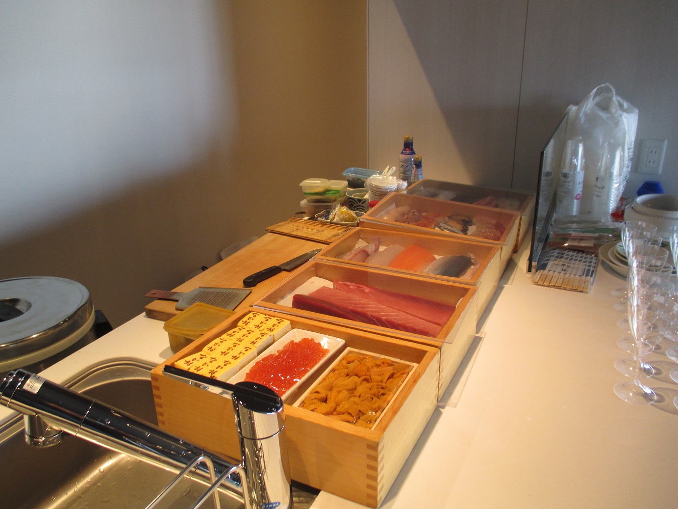 今日は西新宿の高層マンションのパーテーィルームでお仕事。最近のマンションはこう言うパーティルームは定番です。設備も飲食できるように色々設えてあります。遥か山並みの稜線を眺めながら寿司を握るのは楽しいものです。その昔住友ビルにほんの少しだけ働いたことがありました。超高層ビルはまだ少なく朝のエレベータ待ちが20分超の日があり遅刻は鬼の鉄拳がある時代でしたので47階止まりのエレベータに飛び乗り3階を猛ダッシュ。仕事前から疲労困憊した事を思い出しました。